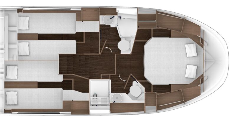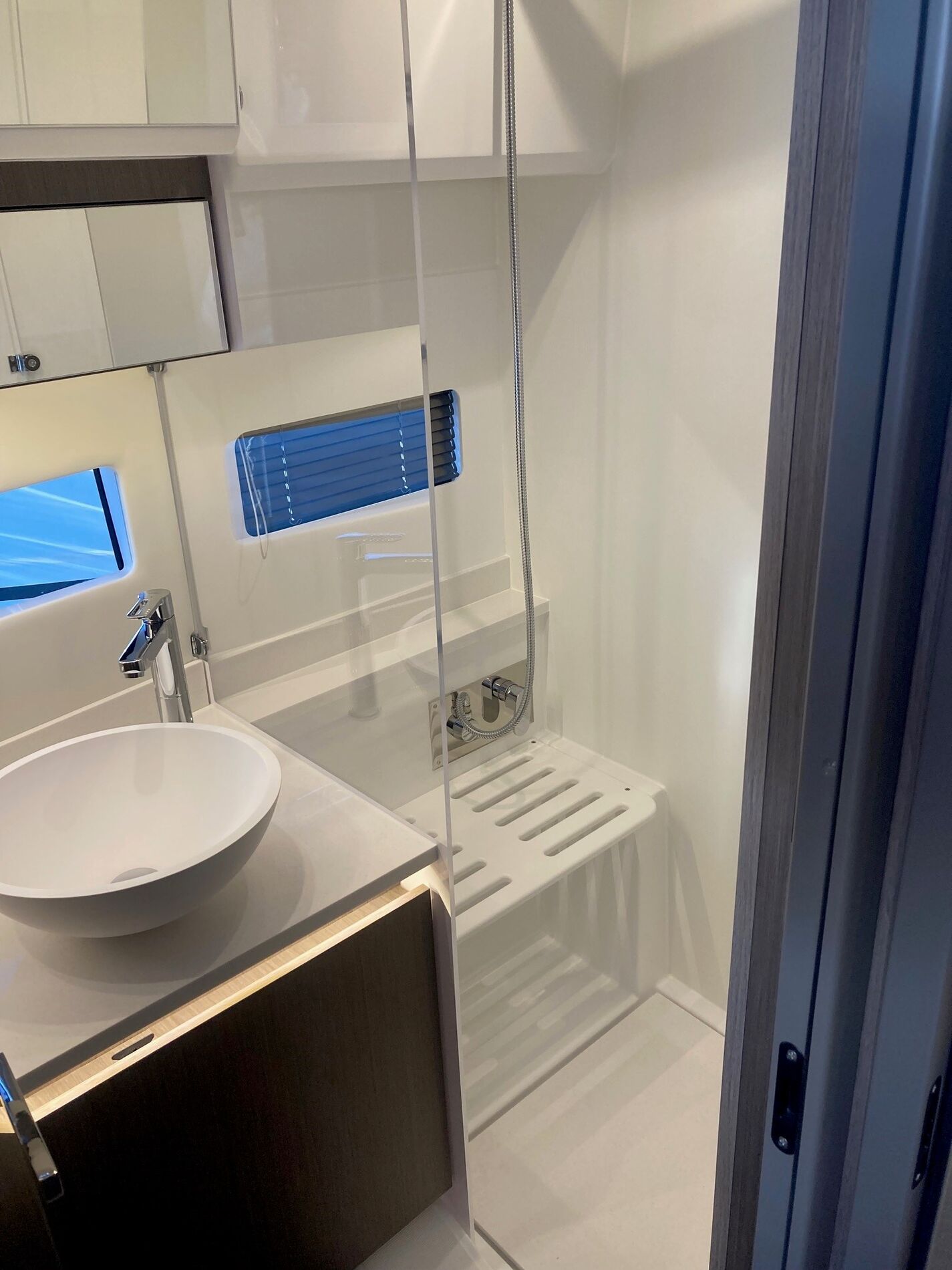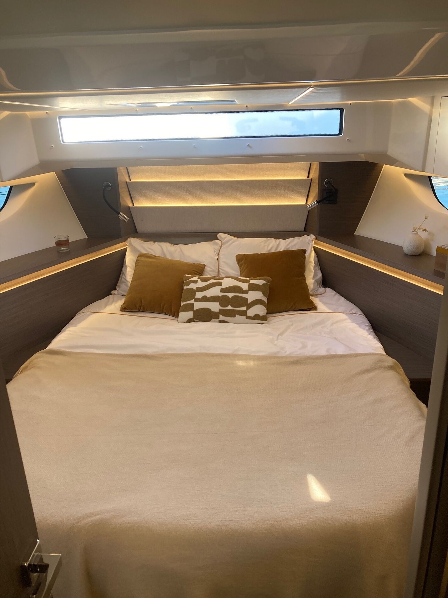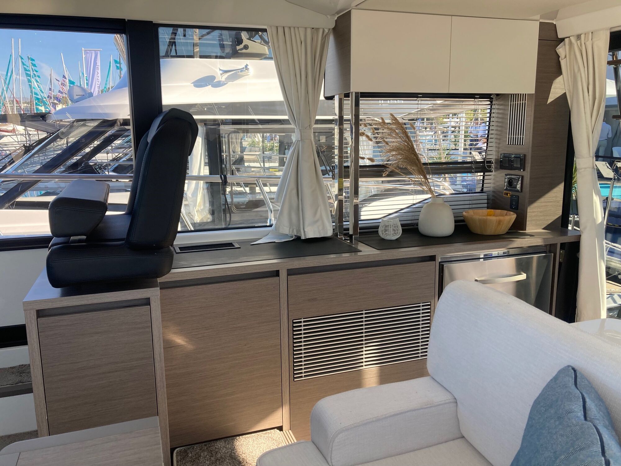 Ce nouveau modèle concentre à son bord des espaces de vie spécialement pensés pour la détente en famille et entre amis. Place à la baignade et aux moments les pieds dans l’eau à volonté dans le cockpit arrière grâce à la terrasse latérale électrique très spacieuse à tribord. A bâbord, une grande porte de coupée facilite l’embarquement pour tous vos convives. A l’avant, prélassez-vous loin du quotidien confortablement installé sur l’une des trois chaises longues intégrées, moments 100 % farniente garantis ! Pour les amoureux du soleil, profitez du fly tout équipé pour piloter à pleine vitesse, bronzer en toute intimité, et profiter d’un cocktail vue mer en fin de journée !