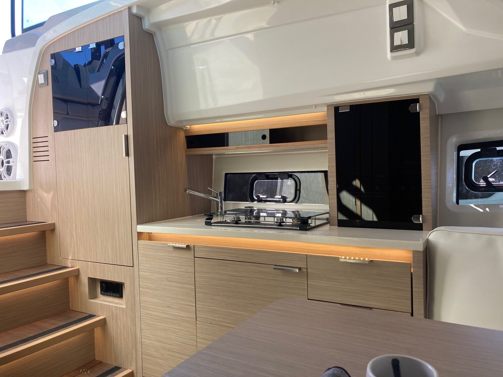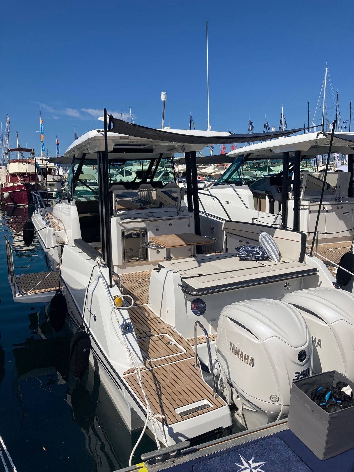Le chantier a développé une nouvelle version du Cap Camarat 10.5 WA S 2 pour les propriétaires de l'Europe du Nord, dont plus de 300 unités ont désormais été livrées. Grâce au pare-brise intégral et aux vitres latérales courtes, vous êtes parfaitement à l'abri du vent et des projections d'eau. Grâce au hublot ouvrant dans la pare brise et àau panneau coulissant dans le toit, vous pourrez profiter d'une brise fraîche dans vos cheveux par temps chaud. Pour 2025 ce modèle sera équipé de la finition de boiserie Chêne Sable